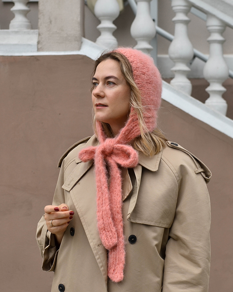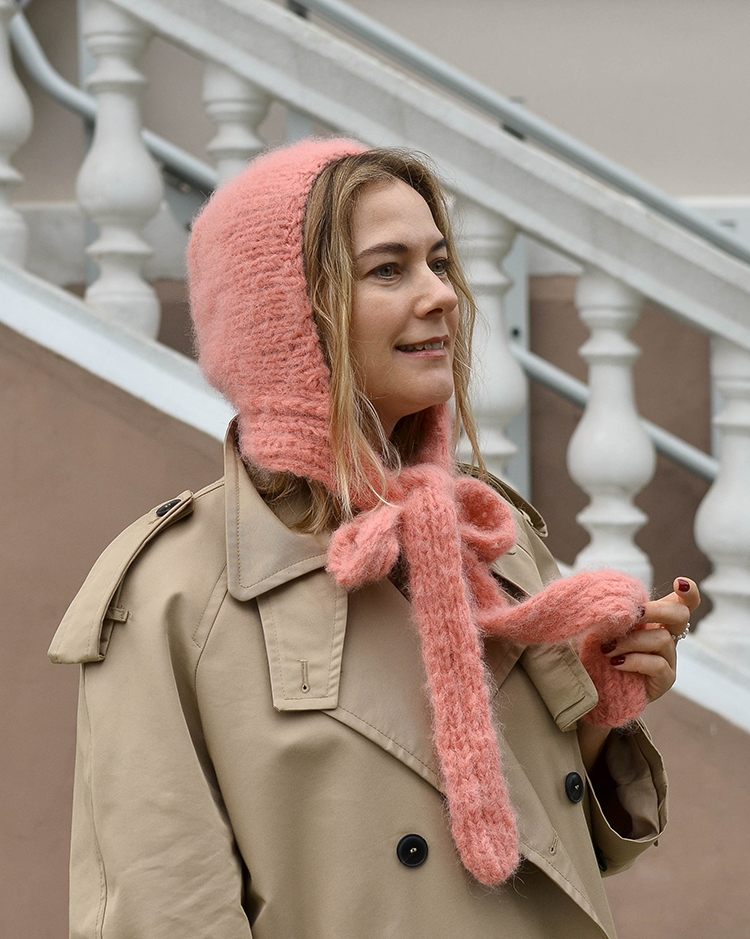 Pūkuota moherinė kepurė su ilgais raišteliais, kuriuos galima užrišti kaip šaliką arba stilingą kaspiną. Megzta iš minkštų, jaukių bei šiltų siūlų, puikiai apsaugo galvą nuo šalčio.